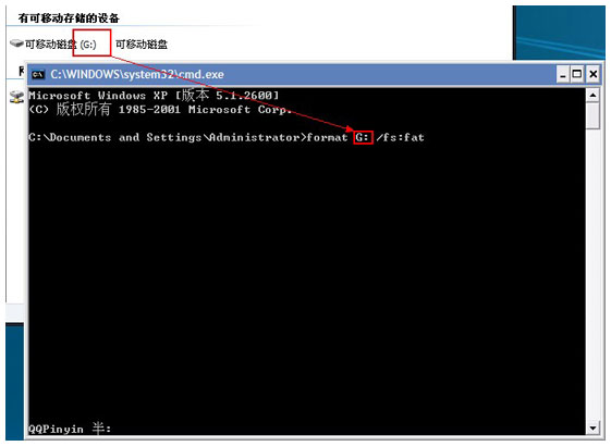 方法三:如果U盘或存储卡的容量是4G的,可连接到电脑通过DOS命令“format 盘符: /fs:fat”格式为FAT格式。