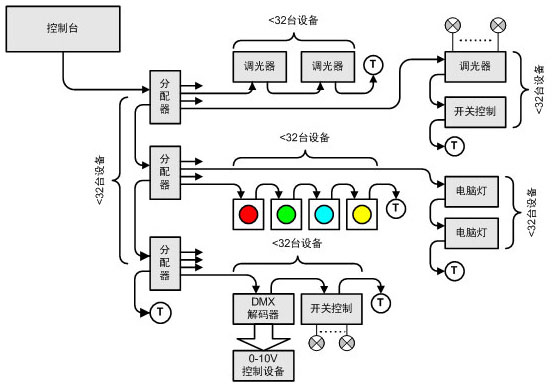 实际上,DMX512只有512个数据通道,即最多只能容纳512台设备(以每台设备只使用1个通道计算)。上图可以看作1个DMX512域,即每个域有512个数据通道。超过512通道就要使用多个DMX512域来数据传输。