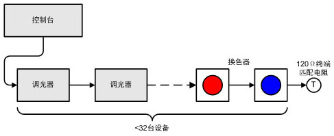 由于DMX512采用EIA-485接口标准,因此在数据总线上连接的设备不能超过32台。这是由于接口电路的电特性决定的。现在有些接口IC已经对此特性进行了改进,也就是说,如果设备厂家采用某些新型IC,数据总线则可以接入更多的设备。