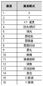 以下是作为例子的A厂家型号为M的16通道光束灯的通道表。