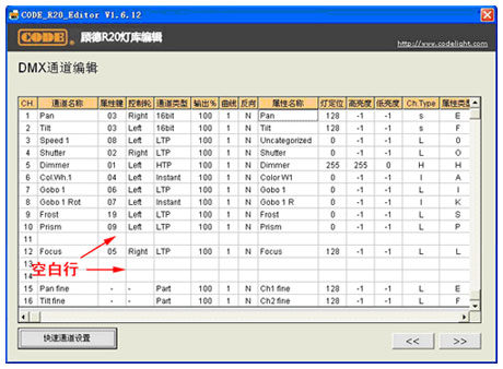 完成"快速通道设置"后,表格中仍然有一些行是空白的,这些通道就需要用户手动完成编辑了。