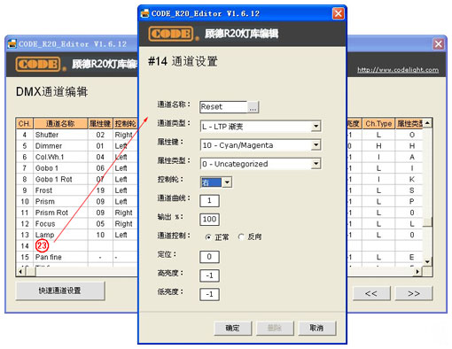 "快速通道设置"界面可选择中英文显示模式,但是这并不意味着生成的灯库文件也会显示为中文,因为R20文件暂时还不支持中文字体,中英文显示模式只是为了照顾不懂英文单词的用户,使得大家在编辑通道时能够方便一些。